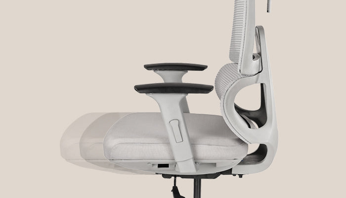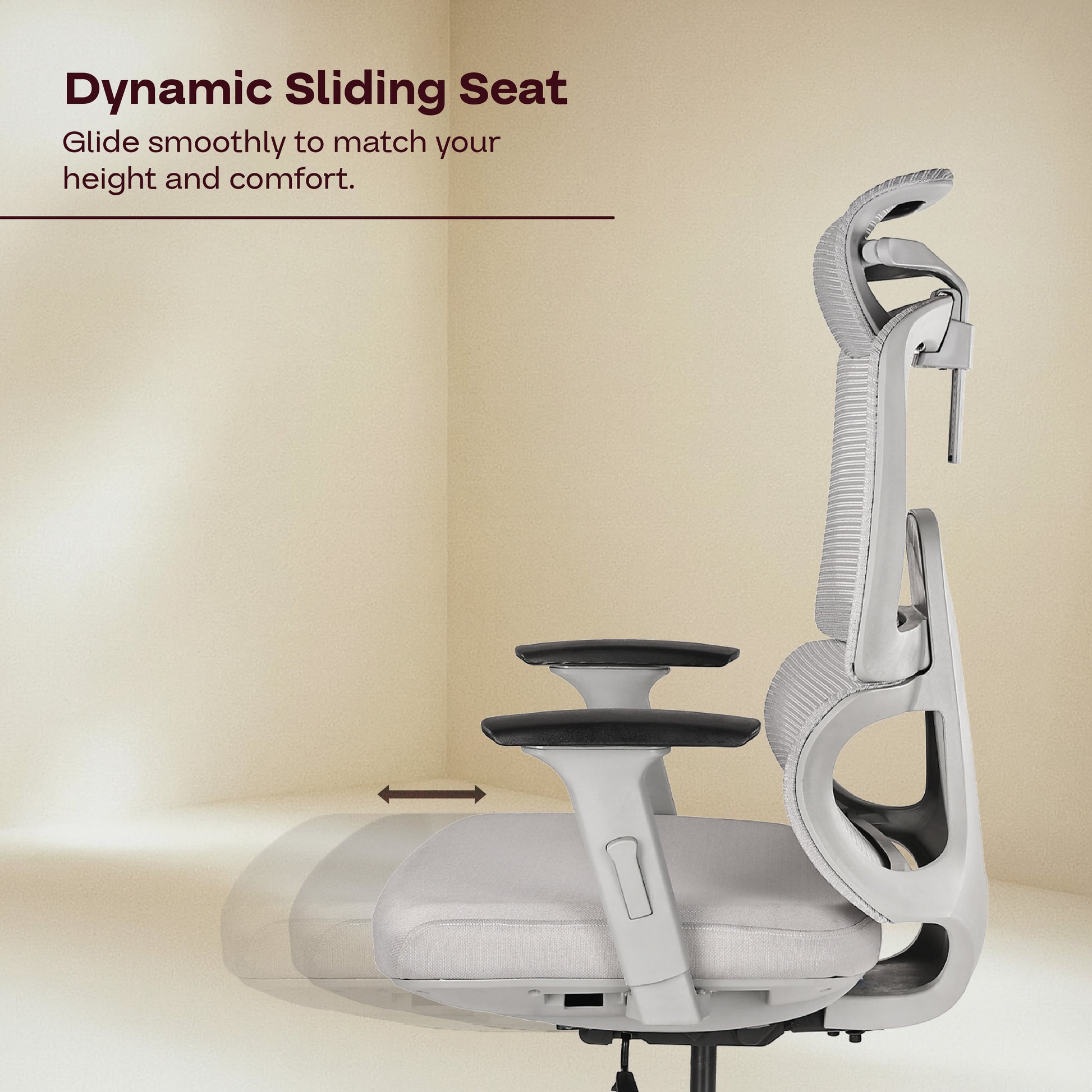 Dynamic seat slider adjusts for leg support. It enhances circulation and comfort during long hours in an ergonomic office chair.